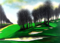 光と影がグリーンをまだら模様に染めている美しい瞬間をとらえたデペルトのゴルフ場を描いた作品です。一列にどこまでも続く樹形は山を目指しているのでしょうか。池に移りこむ木々はまた別の顔を見せています。太陽と雲のバランスが一種独特の空気感を形成し、美しくミステリアスな風景画に仕上げています。緑が目に鮮やかです。繊細で重厚感のある光を感じる秀作で、広いスペースにも飾れる大形絵画です。