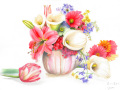 愛らしいブーケのように生けられた色とりどりの花たち。赤、ピンク、黄色、紫と幸せ一杯の雰囲気が伝わってくるやさしい水彩画です。記念やお祝いに贈られたら喜ばれる、明るく春の香り漂う素敵な作品です。