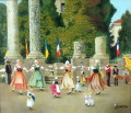 プロバンス地方の都市アルルの有名な衣装祭りの様子を描いたフランス風景画です。伝統的な美しい衣装を着けた人々の楽しげな雰囲気が伝わってくる心躍る油彩画の作品です。
