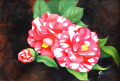 咲き誇る華麗な椿。シックな背景の中でさらに輝きを増しています。赤と白と緑がとてもきれいです。はつらつとした椿のパワーを感じる作品です。油絵独特の艶感もあり、椿の愛らしさを見事に描き出しています。
