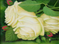 純白の薔薇です。まるで眠りの森で咲いているような静かな雰囲気の油絵です。0号という小品ですが、優雅でヒロインのよう趣きがあるので、素敵な場所に飾りたいです。お祝いや記念に贈ってもらったら嬉しい絵画ですね。