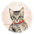 突然目が合ってしまった子猫は、赤い首輪をしていました。ハッとしたつぶらな瞳が印象的で、それからずうっと私の頭の中に住んでいます。瞬間の子猫の表情を巧みにとらえた山中先生の秀作です。小さいサイズのパステル画なので、好きな場所に飾れます。