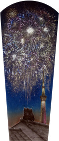 メルヘンの中の猫たちは何とロマンチックなのでしょう。花火を見ながら二匹の輝く未来に思いを馳せているのでしょうか。スカイツリーをバックに夜空に浮かび上がる花火は幸せの象徴です。ラブラブの後ろ姿もいいですね。可愛い癒し系の作品です。結婚する猫好きの方がいたら、プレゼントしたくなりますね。山中先生のピュアな一面をのぞかせる素敵な作品です。